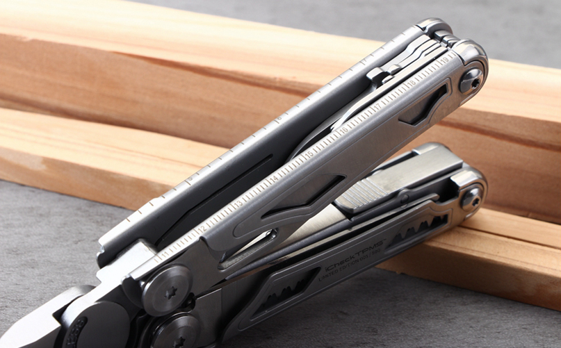 Plier, wire cutter, wire stripper, knife, serrated knife, scissors, saw blade, big/medium/small flat screwdriver, phillip screwdriver, bit driver socket, can opener, bottle opener, awl, ruler, pocket clip.