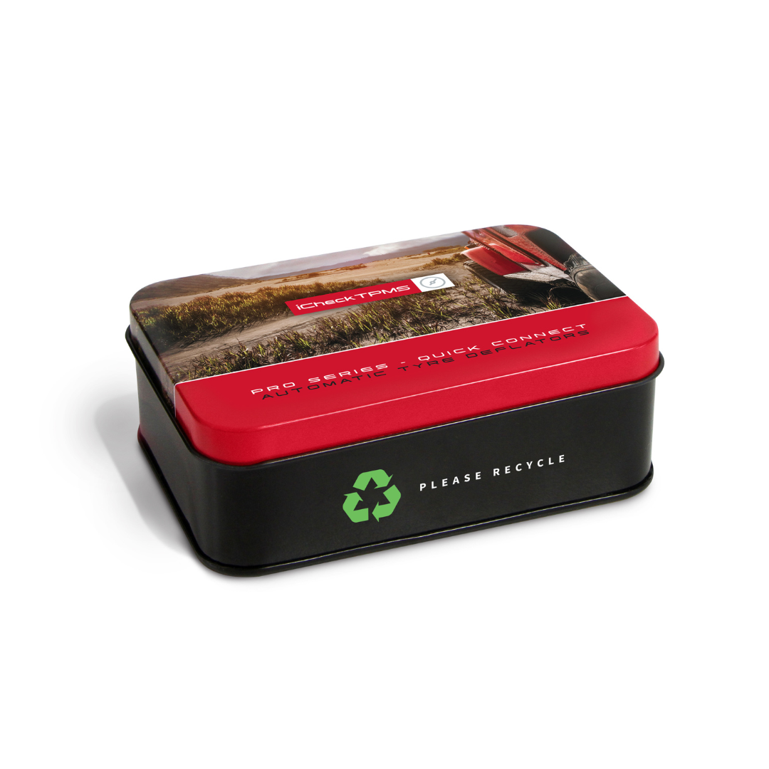 The Pro Series kit contains four tyre deflators in a protective tin with printed instructions.